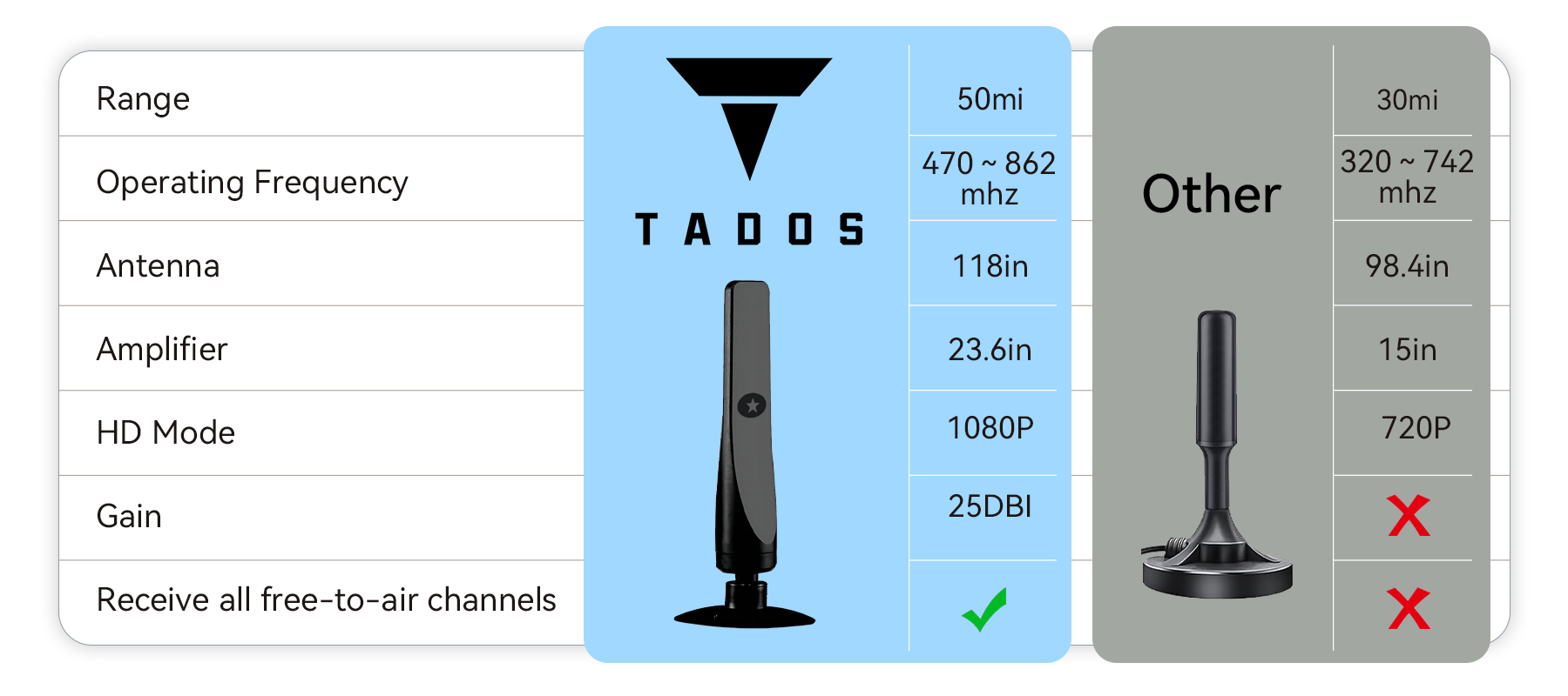 The Tados TV Antenna utilizes an advanced 25DBI High-Gain Design. This crucial technology is engineered to boost signal reception, especially for weak signals in long-distance or complex environments. High gain ensures your TV picture is stable and smooth, eliminating interference for a clearer, more reliable viewing experience.